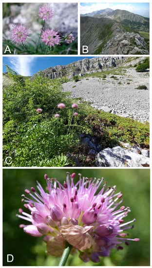 The genus Allium L. (Amaryllidaceae) is one of the richest and largest monocotyledonous genera, comprising about 1000 species [1,2]. It is distributed in temperate, semi-arid and arid regions of the Northern Hemisphere, with very rare exceptions [3,4]. The center of diversity of the genus extends from the Mediterranean basin to Central Asia [5]. Based on molecular phylogenetic studies, the genus Allium has been divided into 15 subgenera and 72 sections [4], which have been further classified into three evolutionary lineages. The classification of the genus is continuously revised and updated (e.g., [6,7,8]). With regards to Italy, Allium is represented in 78 taxa (species and subspecies), of which twenty-five are endemic and nine are alien species [9,10].