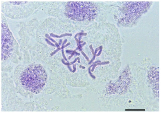 Mitotic metaphase plate of Allium ducissae 2n = 16 + 2B. Image obtained with a Leica DM750 light microscope (original magnification: 1000×). Scale bar: 10 μm.