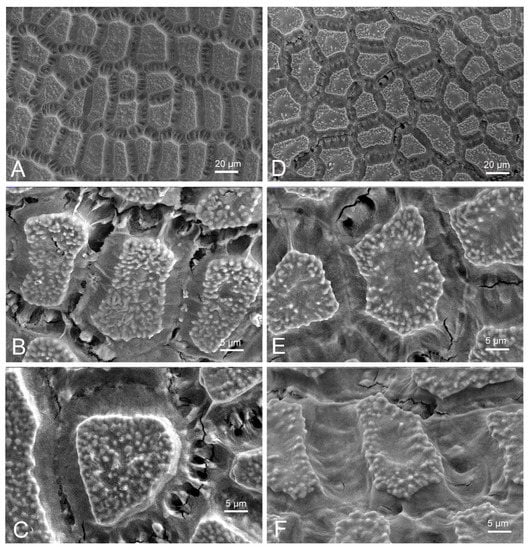 Scanning electron micrographs of seed testa sculptures. (A–C) Allium ducissae. (D–F) A. palentinum.