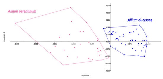 This study is based mainly on field surveys, on an extensive analysis of relevant literature, and on the examination of herbarium specimens preserved at APP, BCN, MA, PI, and SALA (herbarium codes according to [30]) (Supplementary File S1). Morphological observations and measurements of 21 quantitative characters, considered as diagnostic in Allium, were analyzed on fresh material and dried herbarium specimens (Table 1). A total of 52 individuals of the new species (“DUC”) from three localities in the Central Apennines (Lazio: Mt. Morrone and Murolungo; Abruzzo: Mt. Rozza), and 45 of A. palentinum (“PAL”) from several localities in the Cantabrian Mountains (NE Spain), were analyzed. For each quantitative character, the Shapiro–Wilks normality test was first used to determine their distribution, then an independent sample t-test, after logarithmic transformation were carried out with SPSS ver. 25 software (IBM Corp., Armonk, NY, USA) [31]. Principal coordinate analysis (PCoA) was performed in PAST package ver. 4.04 software (Natural History Museum, Oslo, Norway) [32,33]. Some samples with missing data were not included in the principal coordinate analysis. Furthermore, the variability of the analyzed morphological characters was described by standard statistical parameters (mean, standard deviation, minimum, maximum, 10th and 90th percentiles). Boxplots were built through SPSS version 25. All morphological characters of dried material were observed with a Leica MZ16 stereoscopic microscope.