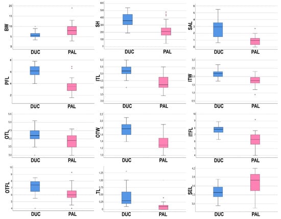 Boxplots expressing morphological variation between Allium ducissae (DUC) and A. palentinum (PAL): bulb width (BW), stem height (SH), spathe appendage length (SAL), pedicel flower length (PFL), inner tepal length (ITL), inner tepal width (ITW), outer tepal length (OTL), outer tepal width (OTW), inner filament length (ITFL), outer filament length (OTFL), tooth of inner filament length (IFTL), seed length (SEL). Outlined central box depicts middle 50% of data, extending from 25th and 75th percentiles, and horizontal bar is the median. Ends of vertical lines (or “whiskers”) indicate minimum and maximum data values, unless outliers are present, in which case whiskers extend to a maximum of 1.5 times inter-quartile range. Circles indicate outliers.