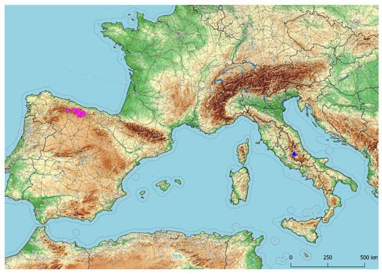 The present study aims to critically review the taxonomy and systematics of some peculiar Allium populations occurring on the mountains of the Central Apennines in the Lazio and Abruzzo administrative regions (Italy). These populations are currently attributed to A. strictum Schrad. [9,11,12,13,14,15], a species described from Siberia [16] belonging to A. subgen. Reticulatobulbosa (Kamelin) N.Friesen sect. Reticulatobulbosa Kamelin [4]. The latter section is characterized by sub-conical bulbs inserted above a short rhizome, with reticulated tunics and linear, flat leaves [4,17]. Allium strictum is a Eurasian species distributed in Europe, Russia, Kazakhstan, Kyrgyzstan, Mongolia and China [12,18,19]. Some authors (e.g., [13,20]) have highlighted the uncertain systematic position of the Apennines’ populations of A. strictum, suggesting further study. Based on a preliminary morphological analysis, these populations showed peculiar features, and turned out to be morphologically different from A. strictum, and therefore obviously cannot belong to the same species [21]. These populations are distinguished from A. strictum by coriaceous bulb tunics (vs. reticulate), leaves with smooth margins (vs. scabrous-denticulate margins), stamens that are long-exserted (vs. usually slightly longer than perianth segments), inner filaments with an acute tooth on each side (vs. rounded tooth), and conical stigma (vs. subcapitate to capitate stigma). Based on our preliminary observations, the Apennines populations belong to A. subgen. Polyprason Radić, and are close to A. palentinum Losa & P.Monts., an endemic species to the Cantabrian Mountains (NE Spain [22,23,24]). This latter species is classified in A. sect. Daghestanica (Tscholok.) N.Friesen [25], a section including the European species A. ericetorum Thore, A. ochroleucum Waldst. & Kit., A. kermesinum Rchb. [26], and A. suaveolens Jacq. These species are distributed from Carpathians across the Balkans and the Central Apennines to northern Spain and Portugal [9,24,27,28,29].