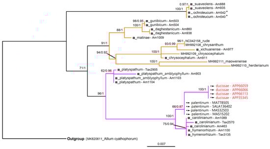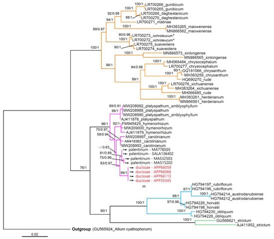 Maximum likelihood (ML) phylogram of newly generated and previously published plastid sequences of Allium (trnQ(UUG)-rps16, trnL(UAA)-trnF(GAA), and rpL32-trnL(UAG) IGS) (GenBank code or symbol (□) + specific epithet). The symbol (□) indicates that the sample has three GenBank codes corresponding to the analyzed markers. A single Genbank code corresponds to the plastid genome of the specimen. The newly generated sequences have symbol (•►) and in red the samples of A. ducissae sp. nov. Accessions belonging to A. sect. Daghestanica are shown with orange branches and sect. Falcatifolia in pink. ML bootstrap values followed by Bayesian posterior probabilities are shown above the branches (BS/PP values > 50%). *, species reported in Freisen et al. [25] as A. ericetorum Thore. For information of the samples see Supplementary Table S1 and for concatenated cpIGS matrix see Supplementary File S3.