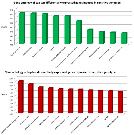 On the contrary, 417 genes were induced while 636 genes were repressed exclusively in the sensitive genotype. Interestingly, genes such as Cytochrome P450 and MYB transcription factor were commonly differentially expressed between the contrasting genotypes. However, these were induced in the tolerant genotype and repressed in the sensitive genotype.