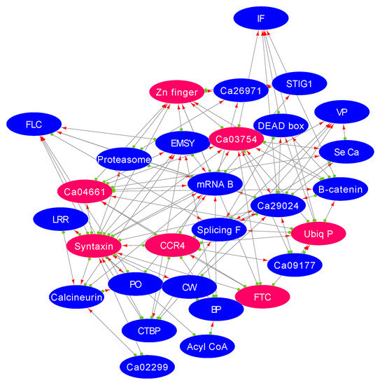 Furthermore, STIG1 is an important gene that increases pollen tube growth. STIG1 binds to pollen receptor kinase and has improved pollen tube growth and seed production [46]. STIG1 was highly induced in the tolerant genotype (Ca07478; FC: 58.4 ↑) while repressed in the sensitive genotype (Ca07478; FC: −1.87 ↓) (Figure 7). The flowering time control (FTC) gene instigates an important gene involved in signalling, splicing, and transcription, leading to upregulation of the FLC and STIG1 gene in the tolerant genotype. FTC gene significantly targets genes such as CCR4, syntaxin, Zn-finger TF, and ubiquitin-proteasome, suggesting that flower time is controlled through cell trafficking and homeostasis [47]. Membrane trafficking is often associated with floral organ separation and development. Modulations in these pathways could be an important mechanism that helps chickpea to maintain flower numbers during salt stress [48].