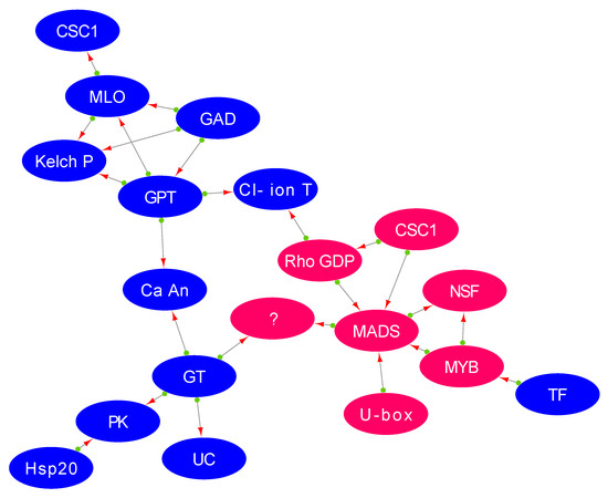 The two essential transcription factors, MYB and AGAMOUS-MADS-box protein, are thought to be widely distributed in plants. They regulate the elongation of stamen filament, anther development, pollen viability, pollen development, and flavonoid synthesis pathways [49,50]. Similarly, co-expression network analysis in our findings revealed that MADS-box—a target of the MYB gene—instigates the expression of genes involved in cell polarity and trafficking (Figure 8). The MYB transcription factor MYB 114, which is involved in pollen development, was induced in the tolerant genotype (Ca05149; FC: 5.24 ↑) while being highly repressed in the sensitive genotype (Ca01728; FC: −6.29 ↓). Interestingly, the upregulation of MYB induced AGAMOUS-MADS-box protein, which was 19-fold up-regulated in the tolerant genotype (Ca20056; FC: 76.10 ↑) compared to the sensitive genotype (Ca20056; FC: 4.08 ↑). The upregulation of this gene suggests floral and reproductive organ development, and cell division and enlargement in the tolerant genotype, as noted above during the salt stress.