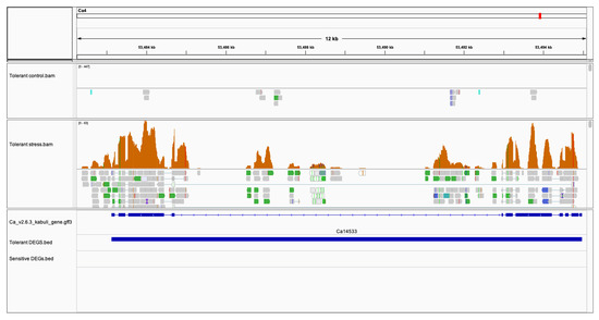 Integrative Genome Viewer (IGV) shows upregulation of ABORTED MICROSPORES (AMS) (Ca14533) gene in tolerant genotype as compared to sensitive genotype in response to salt stress. The tracks include CDC frontier Kabuli v2.6.3 reference fasta; annotated gene. gff3; accepted.hits.bam from tolerant control and control stress and differentially expressed gene coordinates.