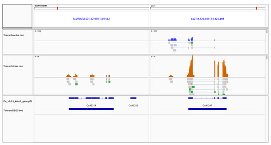 Integrative Genome Viewer (IGV) shows upregulation of jasmonic acid gene (Ca33319) induces FLC gene (Ca31297) in tolerant genotype in response to salt stress. The tracks include CDC frontier Kabuli v2.6.3 reference fasta; annotated gene. gff3; accepted.hits.bam from tolerant control and tolerant stress and differentially expressed gene coordinates.