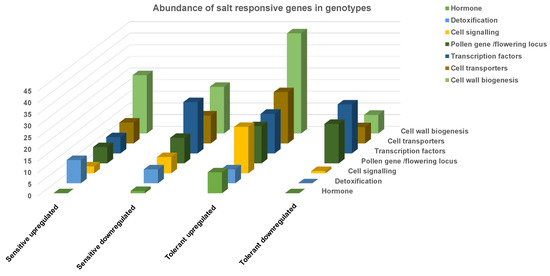 The top differentially expressed genes in the tolerant genotype were thaumatin proteins, oxoglutarate-dependent dioxygenase, spermidine synthase, and aminocyclopropane-1-carboxylate oxidase. Thaumatin protein gene was highly induced in the tolerant genotype (Ca30893; FC: 1698.44 ↑) while repressed in the sensitive genotype (Ca30893; FC: −1.16 ↓). Thaumatin proteins are osmotins that belong to the pathogenesis-related (PR) genes. Thaumatin gene has been reported to be up-regulated in response to biotic and abiotic stresses [33]. Thaumatin is a stress-responsive gene that imparted salt tolerance in Ocimum and peanut [34,35]. Another vital gene, Enzyme inactive 2- (AOP2), was highly induced in both tolerant (Ca20688; FC: 873.0 ↑) and sensitive genotype (Ca06612; FC: 349.7 ↑). The AOP2 has biochemical significance and is involved in the biosynthesis of phytochemicals such as flavonoids, gibberellins, and ethylene [36]. The genotypes significantly differentially regulated other essential salt stress-related genes such as jasmonic acid, gibberellin responsive, polygalacturonase, and pollen receptor (Figure 4 and Figure 5).