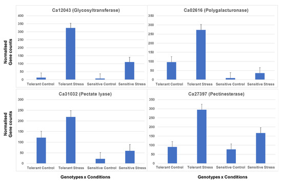 Cell wall remodelling is essential in cell expansion, membrane transport, and stress signalling [58,59]. Several important genes involved in cell wall organisation such as polygalacturonase, pectinesterase, glycosyltransferase, and lipid transfer proteins were amongst the top differentially expressed genes having more significant fold change in the tolerant compared to the sensitive genotype. Glycosyltransferase overexpression in tobacco has been observed to enhance salt tolerance by increased accumulation of proline and sugars, and reduced Na+/K+ ion concentration [60,61]. We identified that glycosyltransferase genes were highly induced in the tolerant genotype (Ca12043; FC: 347.2 ↑) but were repressed in sensitive genotype (Ca00611; FC: −48.8 ↓). Notably, essential cell wall genes such as pectinesterase, polygalacturonase, and pectate lyase were highly induced during the salt stress in the tolerant genotype (Figure 12). The expression of these cell wall genes indicates the floral organs’ developmental process and the ion channels’ regulation. It could be that induction of these genes in the tolerant genotype denotes the elongation of the pollen tube during the salt stress.