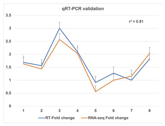 2.2. Validation of RNA-seq Results with Quantitative Real-Time PCR (qRT-PCR)
