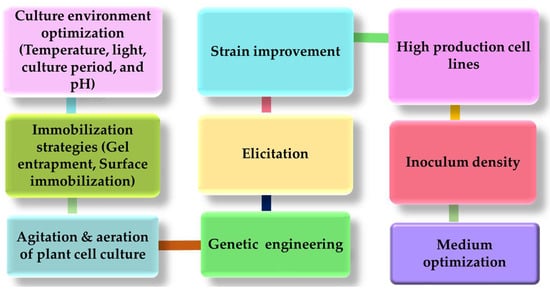 Recently, the production of secondary metabolites by using plant cell and tissue culture has become exciting new science. Several approaches are being routinely used by plant biotechnologists to improve secondary metabolite production by the selection of high producing cell lines, strain improvement, medium optimization, metabolic engineering, and elicitation as presented in Figure 2. One of the most important requirements is the in-depth knowledge of biosynthetic routes and mechanisms involved in the accumulation of secondary metabolites. The lack of knowledge of underlying mechanisms involved in the biosynthesis of useful secondary metabolites is the first barrier in developing commercial processes. One of the biggest challenges in the industrial application of plant cell, tissue, or organ culture for the efficient production of commercially relevant bioactive compounds has been stated to have a low product yield [44].
