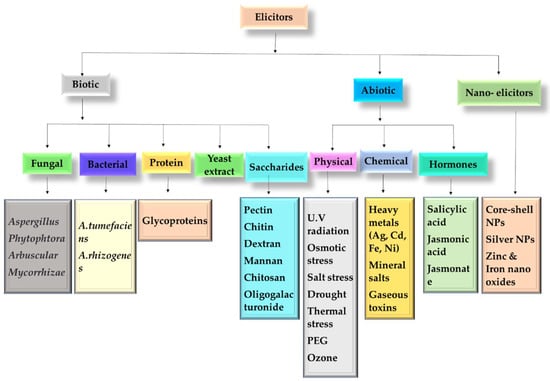 Elicitors can be exogenous or endogenous factors that can trigger the production of secondary metabolites. The endogenous or biological elicitors include glycoproteins, organic acids, and membrane polysaccharides such as cellulose, pectin, glucans, chitosan, etc., while the exogenous Elicitors consist of heavy metals, pH and temperature, intensity and duration of light, and nutrients in culture medium. The secondary metabolism in plants can be induced by physical components such as osmotic shock, water stress, ultraviolet (UV) radiation and ozone, etc. [56]. Upon elicitation, by any of these compounds a cascade of reactions is originated, that activates the plant’s innate immune system. To mediate the defense response, the plant signaling compounds such as nitric oxide, salicylic acid, and methyl jasmonate play an important role.