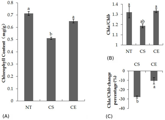 The Chl analysis showed that CE plants had a significantly higher Chl content than CS plants (p < 0.05) (Figure 1A), demonstrating that ethephon pretreatment increased the Chl content under cold stress. Figure 1B shows that the ratio of Chla to Chlb did not change significantly, except for a slight increase in CE plants than in CS plants (p = 0.147) (Figure 1B). Moreover, the Chla/Chlb ratio change percentage relative to day 0 of CE plants was significantly lower than that of CS plants (sig = 0.027, 0.001 < 0.05) (Figure 1C), which indicated that ethephon pretreatment suppressed the decline of the Chla/Chlb ratio under cold-stressed conditions. Combined with the data in Figure 1B, it is affirmed that ethephon pretreatment could increase the Chla/Chlb ratio under cold stress.