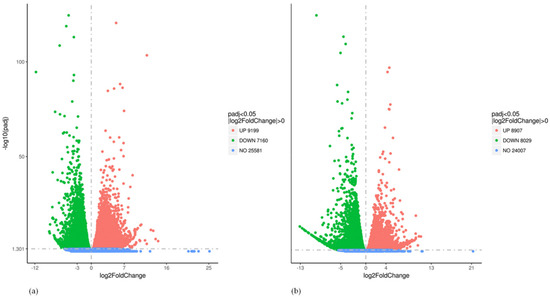 (a) Distribution of differential genes in volcanic map (CS vs. NT); (b) Distribution of differential genes in volcanic map (CEvs. NT).