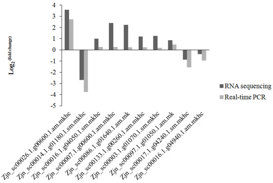 Log2 (fold change) of genes based on RNA-Seq and qRT-PCR methods.