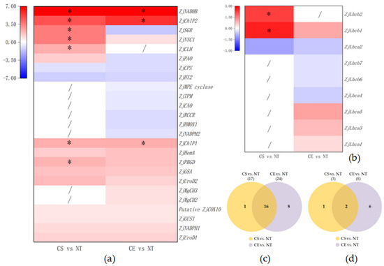(a) Heat map of differentially expressed genes in porphyrin and chlorophyll metabolism pathway; (b) Heat map of differentially expressed genes in photosynthesis-antenna proteins pathway; (c) Venn diagram for all DEGs in porphyrin and chlorophyll metabolism pathway; (d) Venn diagram for all DEGs in photosynthesis-antenna proteins pathway; “/” indicates the DEG was not enriched in this KEGG pathway comparison; and “ * “ means the log2 (fold change) of this gene is greater than 2. Gene expression in log2 (fold change) scale was elevated with red and decreased with blue.