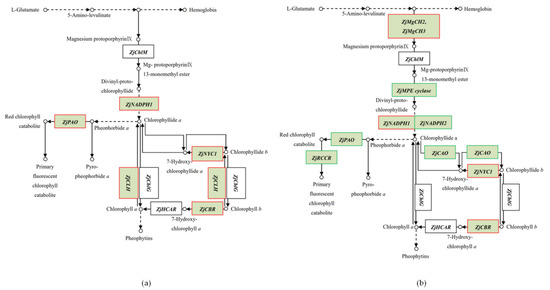 (a) KEGG metabolic pathway based on the comparison of CS vs. NT that matches the chlorophyll metabolic pathway; (b) KEGG metabolic pathway based on the comparison of CE vs. NT that matches the chlorophyll metabolic pathway. KEGG nodes indicating upregulated genes are marked in red, KEGG nodes indicating downregulated genes are marked in green. Symbols: → synthesis, ⇢ indirect synthesis, ○ synthesized product.