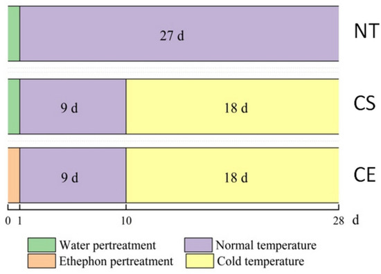 Zoysia japonica Steud. cv. Chinese Common plants were obtained from the Turf Research Field of the Beijing Forestry University. After transplanting, the Z. japonica plants were randomly placed in the greenhouse of the Beijing Forestry University. The greenhouse conditions were as follows: light intensity of 400 μmol m−2 s−1, daily light period of 14 h, day/night temperature regimen of 28/18 °C, and water 2–3 times per week after transplanting. Fifteen pots of Z. japonica plants were transferred and acclimated in a growth chamber (day/night temperature of 28/18 °C, light intensity of 3000 lx, light period of 14 h) for approximately one month. Plants were divided into three treatment groups (five pots per group): NT, normal day/night temperature regimen (28/18 °C) with water spray pretreatment as control; CS, cold stress (4 °C) with water spray pretreatment; and CE, cold stress (4 °C) with ethephon spray pretreatment. Ethephon pretreatment was carried out on day 1. Leaves were thoroughly sprayed with ethephon solution until liquid drops started to fall off. The concentration of ethephon was more than 150 mg/L, which was determined by our team in a pervious study [29]. Starting on day 10, the CS and CE plants were subjected to cold stress for 18 days (4 °C) (Figure 7). The cold treatment temperature was set according to Wei et al. [14]. At the end of treatment, fresh leaves of each group were collected.