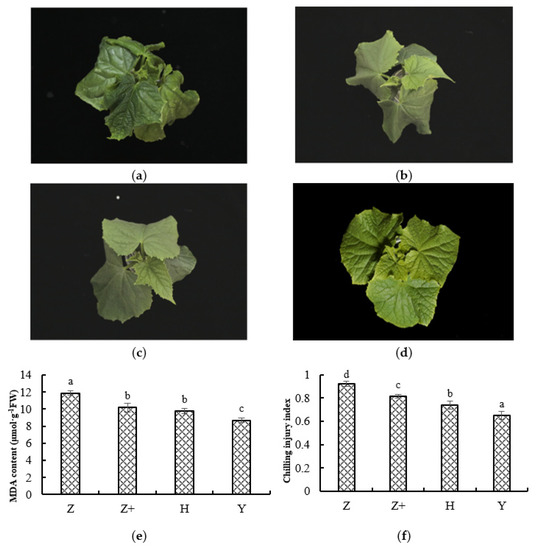 Determination of physiological characteristics under cold treatment. The phenotypes of cucumber seedlings were self-rooted cucumber (a, Z), self-rooted cucumber with silicon addition (b, Z+), ‘Huangchenggen No. 2′-grafted cucumber (c, H) and ‘Yunnan figleaf gourd’-grafted cucumber (d, Y). MDA content (e) and chilling injury index (f) of cucumber seedings under cold treatment for 7 days, respectively. Three biological replicates were used, with six plants per replicate. Mean value ± standard deviation were represented, and different letters (a, b, c) indicate that they were significant differences at a level of 0.05, according to Duncan’s test.