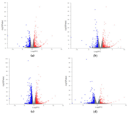 Volcano Polt of differentially expressed genes (DEGs). (a) Comparsion of self-root cucumber with silicon addition (Z+) and self-rooted cucumber (Z); (b) comparsion of ‘Huangchenggen No. 2′-grafted cucumber (H) and self-rooted cucumber (Z); (c) comparsion of ‘Yunnan figleaf gourd’-grafted cucumber (Y) and self-rooted cucumber (Z); (d) comparsion of ‘Yunnan figleaf gourd’-grafted cucumber (Y) and ‘Huangchenggen No. 2′-grafted cucumber (H). The red column indicates the number of upregulated genes, whereas the blue one means downregulated genes.