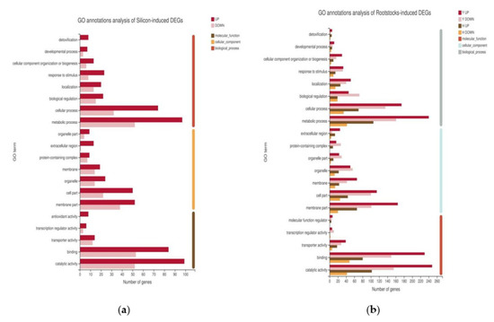 To further investigate the biological functions of rootstock grafting and silicon-induced DEGs under cold stress, we performed a functional annotation of DEGs via Gene Ontology (GO). By comparing with the GO Consortium, we found that the silicon-induced DEGs were similar to the rootstock-grafting-induced DEGs in terms of functional classification, mostly in the metabolic process, catalytic activity, membrane part, binding, and cellular process categories (Figure 3). We also found no difference between the upregulated and downregulated DEGs. These results indicate that most DEGs in cucumbers are involved in metabolic processes, cellular activity, membrane structure, and catalytic activity, suggesting that cold treatment mainly affects physiological metabolism, membrane structure, and cellular activity in cucumbers.