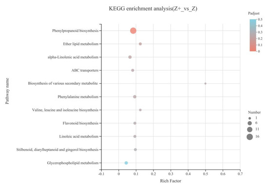 KEGG enrichment analysis of DEGs for the comparison of self-rooted cucumber with silicon addition (Z+) and self-rooted cucumber (Z), and “Benjamini and Hochberg” test was used to detect significantly enriched KEGG terms (FDR < 0.05, p < 0.05).