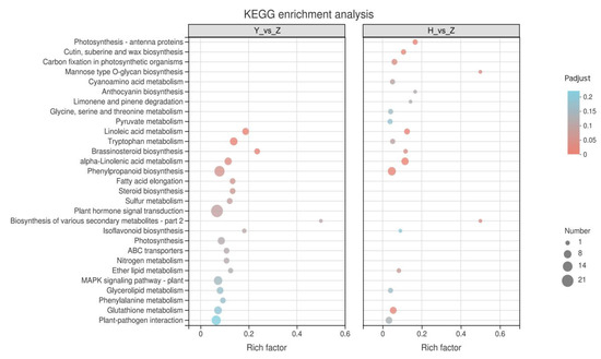 KEGG enrichment analysis of DEGs for the comparison of two kinds of pumpkin-grafted cucumber (H and Y) with self-rooted cucumber (Z), and the “Benjamini and Hochberg” test was used to detect significantly enriched KEGG terms (FDR < 0.05, p < 0.05).