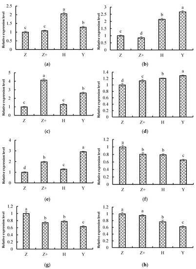 Transcriptome sequencing confirmation by qRT-PCR. The eight genes were randomly selected. Different treatments represent: self-rooted cucumber (Z), self-rooted cucumber with silicon addition (Z+), ‘Huangchenggen No. 2′-grafted cucumber (H) and ‘Yunnan figleaf gourd’-grafted cucumber (Y). Genes were (a) ethylene responsive transcription factor ERF054-like; (b) WRKY transcription factor 48; (c) phenylalanine ammonia-lyase; (d) peroxidase 31; (e) ABC transporter B family member 2; (f) glutathione S-transferase U8; (g) chlorophyll a-b binding protein CP26; (h) abscisic acid receptor PYL2. Mean value ± standard deviation were represented, and different letters (a, b, c, d) indicate that they were significant differences at 0.05 level according to Duncan test.