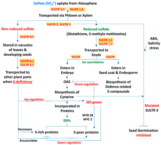 A schematic representation of source-sink relationship of sulfur (S) in plants: an insight in uptake and transportation of sulfate (SO42−) in different plant parts by various transporters (SULTRs) and its assimilation, accumulation of S-containing seed storage proteins (SSPs) and regulation of S-mediated seed germination. (Abbreviations: OAS, O-acetylserine; SDI genes, sulfur deficiency induced genes; MYB28, myeloblastosis28; MYC2, master regulator of cell cycle entry and proliferative metabolism2; ABA, abscisic acid).