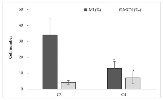 Genotoxicity represented by mitotic index and cells with micronucleus per 100 and 1000 counted cells, respectively, in Vicia root meristematic zone after 48 h of exposure to C3 (EC: 2.01–2.24 dS m−1) and C4 (EC: 3.46–7.00 dS m−1) irrigation water. MI = mitotic index, MCN = micronucleus. Values are mean ± SD (n = 26 for C3 and 24 for C4). * indicates significant difference between C3 and C4 at p < 0.05.