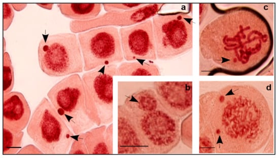 MCN is an extranuclear entity of the damaged part of chromosomes and its origin is attributed to both structural and numerical alterations of chromosomes and, probably, to elimination of excessive genetic material from the main nucleus [,,]. Cell growth, leading to increase of the individual cell’s volume, is strongly influenced by intracellular turgor pressure, cell wall rigidity and flexibility allowing for various cell sizes and shapes []. Modification of the mechanical properties of the cell wall is considered as a major growth-limiting factor during exposure to salinity. It is linked to changes of cell wall capacity to expand []. In this regard, a strong relationship has been found between cell wall stiffening and reduction of the epidermal cell size of maize during an osmotic stress-phase induced by salt treatment [].