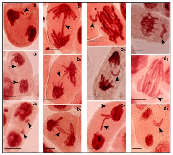 Structural and numerical anomalies found in V. faba cells in division exposed to C3 and C4 irrigation water samples. Structural aberrations include changes in structure of chromosomes: (a) Cell in anaphase with a chromosomal fragment (EC = 6 dS m−1); (a1) Cell in anaphase with two chromosomal fragments (EC = 6 dS m−1); (a2) Cell in telophase with two chromosomal fragments (EC = 7 dS m−1); (b) Cell in anaphase with a bridge (EC = 4 dS m−1); (b1) Cell in anaphase with a broken bridge (EC = 6 dS m−1); (b2) Cell in anaphase with two bridges (EC = 6 dS m−1). Numerical aberrations include changes in number of chromosomes: (c) Cell in anaphase with a lagging chromatid (EC = 6 dS m−1); (c1) Cell in anaphase with a lagging chromatid (EC = 2.2 dS m−1); (c2) Cell in anaphase with two lagging chromatids (EC = 6 dS m−1); (d) Cell at the beginning of anaphase with lagging chromosome (EC = 2.2 dS m−1); (d1) Cell in anaphase with lagging chromosome (EC = 4 dS m−1); (d2) Cell at the end of anaphase with lagging chromosome (EC = 6 dS m−1). Arrow indicates aberration. Magnification: 1000×; Bar = 20 µm.