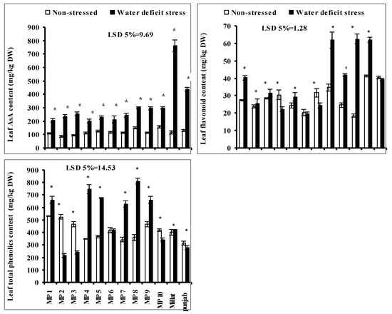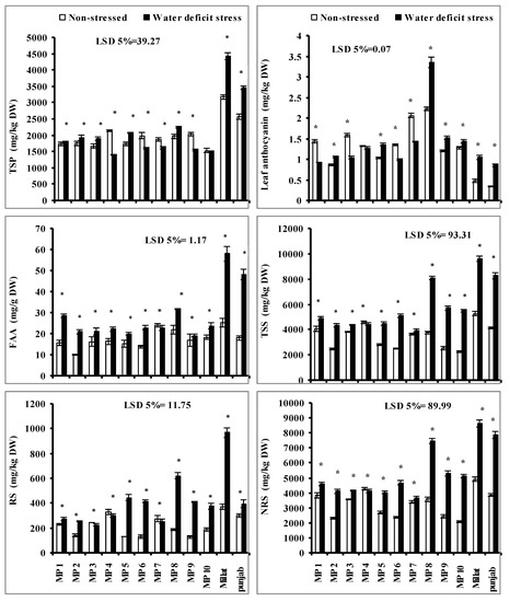 The physio-biochemical traits of plants are considered an important selection tool under stressful environmental conditions, especially water deficit stress, because they have a direct relationship with the plant adaptations to stressful conditions [17]. Plant physio-biochemical responses under water deficit stress include a decreased photosynthetic activity due to membrane disruptions by oxidative stress, the accumulation of toxic metabolites, and perturbations in cellular water relations, leading to a loss of turgidity, and reduction in growth rates and productivity. It is reported that, in crop plants, different physiological responses are linked with their resistance functions under drought, such as a high amount of relative water content, water potential and integrity of membranes [18,19,20]. Perturbations in biomass production are considered as one such important process which is sensitive to drought and linked with the disturbances in cellular water relations [21].