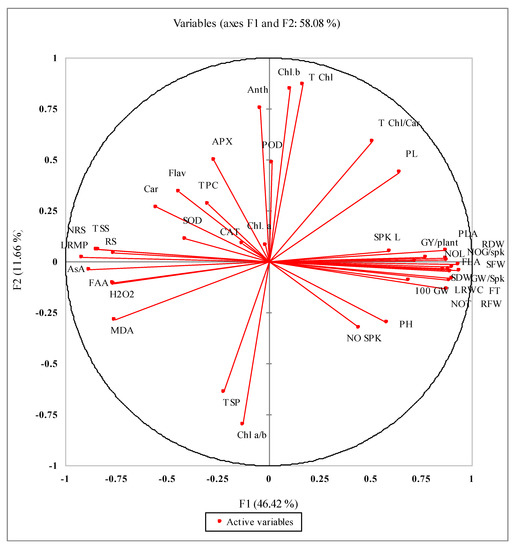 Mostly in crop plants, their selection for better production under drought is mainly based on the different agronomic traits, including biomass and yield traits, and very few cases are reported, considering the different physiological and biochemical attributes in parallel with agronomic traits, which are the main enigma behind the stress tolerance of crop plants [12]. Though the agronomic traits are considered as the most important traits in field crops for their selection for better production under drought [12], it is necessary to select the cultivars with a better yield under stressful environments by considering the physiological and biochemical traits, along with agronomic traits. Work is already in progress regarding the aforementioned aspects, but the mechanism is still unclear. The world’s most major food dependence is on cereals, especially wheat, including in Pakistan where wheat has a complex mechanism due to its hexaploidy nature. Pakistan is an agricultural country and 70% of its population is dependent on agricultural crops for food. Being a staple food, wheat is most consumed crop among the important cereal crops and helps to solve food security problems. Pakistan is in sixth position worldwide for global wheat production and in eighth position for cultivation, producing approximately 3.5% wheat annually [23,24].
