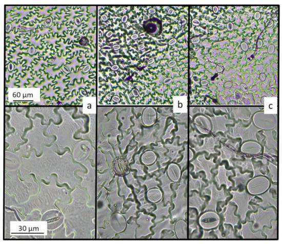 The abaxial surface at the mid lamina of two leaves per treatment and cultivars was covered by nail topcoat to obtain a leaf lamina replica to be observed under a light microscope. Images acquired were analyzed by ImageJ software (National Institutes of Health, MD, USA) to measure epidermal cell area for a total of 20 cells per cultivar and treatment (i.e., a total of 180 measurements). Moreover, epidermal cells were counted in other 20 images per thesis (Figure S1), for a total analyzed surface of about 93,000 µm2 × 20 = 1,860,000 µm2 = 1.86 mm2 for each treatment and cultivar.