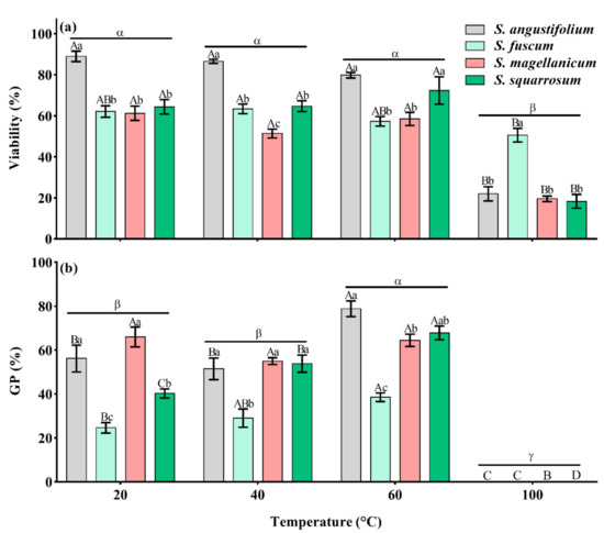 Effects of different heat temperatures on spore (a) viability (dyeing percentage) (b) germination percentage (GP) and in four Sphagnum species. Error bars represent SEM (n = 3). Lowercase letters (a, b and c) represent significant difference among species at the same heat temperature and uppercase letters (A, B, C and D) represent significant difference among heat temperatures in the same species (also in others). “α”, “β” and “γ” represent significant difference among the total germination percentage (21d) and viability after heat treatment.