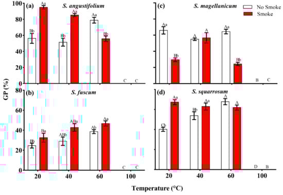Interactive effect between smoke–water and heat on spore germination percentage (GP) in four Sphagnum species ((a), Sphagnum angustifolium; (b), S. fuscum; (c), S. magellanicum; (d), S. squarrosum). Error bars represent SEM (n = 3). Lowercase letters (a, b and c) represent significant difference among smoke–water treatments at the same heat-shock temperature and uppercase letters (A, B, C and D) represent significant difference among heat temperatures at the same smoke–water treatment.
