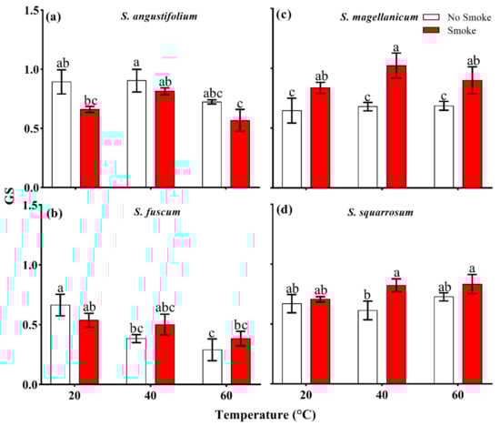 The GS in S. angustifolium and S. fuscum decelerated under the combined treatment of 60 °C + smoke (p < 0.05 for both, Figure 3a,b). In S. magellanicum, the combined treatments of 40 °C + smoke and 60 °C + smoke obviously accelerated the GS (p < 0.05, Figure 3c).