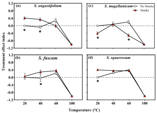 In terms of the treatment effect index (TEI), S. angustifolium, S. fuscum and S. squarrosum showed positive values in the combined treatments of 40 °C + smoke and/or 60 °C + smoke (p < 0.05 for all, Table 2; Figure 4a,b,d). In S. magellanicum, the TEI was negative in the combined treatment of 60 °C + smoke (p = 0.001, Table 2; Figure 4c).