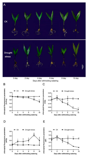The chlorophyll fluorescence parameters including Fv/Fm, Y(II), qP and NPQ reflect the photochemical properties and functionalities of plants and are considered as crucial indicators for evaluating the effect of the environmental conditions on photosynthetic activities [33,34,35,36,37]. Fv/Fm represents the maximal photochemical efficiency of PS II in dark-adapted samples and reflects the photosynthetic performance of plants. Y(II) refers to the actual photochemical quantum yield of PS II in illuminated samples, which is related to the non-cyclic electron transport used for photochemical reactions. Furthermore, qP reflects the degree of openness of the PS II reaction centers and oxidized state of the primary electron acceptor (plastoquinone acceptor, QA). Y(II) and qP in the drought treatment increased with no significant difference compared to the control at 2 days after withholding watering, indicating that areca seedlings were able to regulate the photochemical conversion efficiency to maintain normal photosynthesis at the early stage of water deficit. However, Y(II) and qP in the drought treatment rapidly decreased from the 4th DAT, indicating that prolonged water deficit caused significant damage to the photosynthesis capacity of areca seedlings. Reads of Fv/Fm gradually decreased during the drought treatment, implying that the photosynthetic activities were inhibited by drought. NPQ is a photoprotective regulatory mechanism used by plants against photodamage and acts by thermally dissipating the excess light energy that cannot be utilized by the photosynthetic apparatus. The peak value of NPQ occurred eight days after drought treatment and decreased dramatically thereafter. The increase in NPQ in water-starved areca leaves was inversely related to the trend of Fv/Fm, Y(II) and qP, suggesting that drought stress caused the impairment of the photosynthetic apparatus and weakened the capability of the photosynthetic apparatus to utilize the excitation energy. The dramatic decrease in photosynthetic performance suggested that continuous drought may have disordered the heat-releasing mechanisms in the chloroplasts.