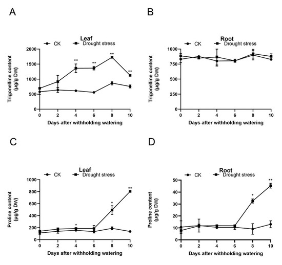 Among all drought tolerance responses, the accumulation of osmolytes to alleviate the adverse effects of drought is a common approach [41,42,43]. Proline is a widely used biochemical marker in plant drought-tolerant responses and is an antioxidant osmolyte that adjusts osmotic pressure and stabilizes protein structures in plants. Drought stress will increase the proline content in plant cells [16,44]. Our study corroborates this, as the contents of proline in the leaves dramatically changed on the 4th DAT and increased with the duration of water shortage (Figure 2C). Trigonelline content in leaves increased significantly at 4 days of drought, peaked on the 8th DAT and then decreased on the 10th DAT (Figure 2A), suggesting that trigonelline was induced by drought and might in turn regulate drought resistance of plants.