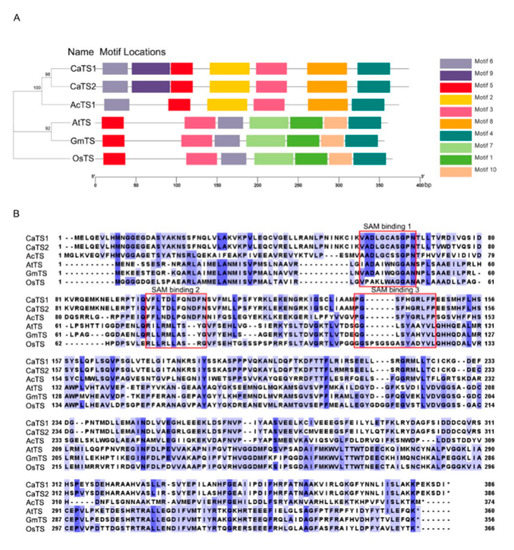 Sequence analysis of trigonelline synthases from different plant species. (A) Phylogenetic tree and conserved motifs of AcTS, CaTS1, CaTS2, AtTS, GmTS and OsTS. Different motifs are represented by different boxes. The location of each motif can be estimated using the scale at the bottom. (B) Alignment of amino acid sequences of AcTS, CaTS1, CaTS2, AtTS, GmTS and OsTS. Three proposed SAM regions are shown in the open boxes. AcTS: Areca catechu trigonelline synthase; AtTS: Arabidopsis thaliana trigonelline synthase; OsTS: Oryza sativa trigonelline synthase; CaTS: Coffea arabica trigonelline synthase; GmTS: Glycine max trigonelline synthase.