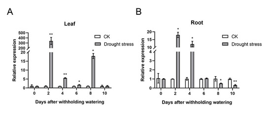 To investigate the evolutionary relationships of trigonelline synthase in different plant species, we constructed a phylogenetic tree based on the full-length amino acid sequences of A. catechu trigonelline synthase (AcTS; id: JAHSVC000000000; BioSample: SAMN19591864), A. thaliana trigonelline synthase (AtTS; NM_115174, BioProject: PRJNA116), Oryza sativa trigonelline synthase (OsTS; Q6K9 × 3, BioProject: PRJNA122), Coffea arabica trigonelline synthase (CaTS; AB054842 and AB054843; BioProject: PRJNA497895) and Glycine max trigonelline synthase (GmTS; NM_001360031, BioProject: PRJNA19861). The results showed that those trigonelline synthases from different plant species could be categorized into three subgroups, in which AcTS and CaTS (CaTS1 and CaTS2) were clustered into the same subgroup and AtTS and GmTS gathered together, while OsTS was grouped into a separate clade (Figure 3A). The MEME analysis revealed that motif 3, motif 4, motif 5 and motif 6 were present in all trigonelline synthases from different plant species, while motif 9 was specifically present in the N-terminal region of CaTS (CaTS1 and CaTS2) compared with AcTS in the same subgroup. In addition, the trigonelline synthases in different subgroups had different specific motifs, which was in line with their phylogenetic clustering (Figure 3A). The TS gene from different plant species consisted of different lengths of CDSs (AcTS: 1122 bp, CaTS1: 1158 bp, CaTS2: 1158 bp, AtTS: 1080 bp, GmTS: 1068 bp and OsTS: 1098 bp), which encoded different lengths of amino acid residues (AcTS: 373 aa, CaTS1: 385 aa, CaTS2: 385 aa, AtTS: 359 aa, GmTS: 355 aa and OsTS: 365 aa) (Figure 3B and Supplementary seq 1 to 12). The alignment of the amino acid sequences of TS revealed that AcTS, CaTS1 and CaTS2 all contained the proposed SAM binding motifs (SAM binding 1, SAM binding 2 and SAM binding 3) (Figure 3B). To test the expression patterns of AcTS under drought, the transcript abundance of AcTS in the areca leaves and roots was determined via quantitative real-time PCR (qRT-PCR). With prolonged treatment, the expression level of AcTS remarkably increased in both the leaves and roots on the 2nd DAT, with expression levels that were ~80-fold and ~6-fold higher than that in the controls, respectively (Figure 4A,B). On the 4th and 6th DAT, the expression level of AcTS in the leaves were lower than that on the 2nd DAT, while the level was still significantly higher in the treatment group than that in the controls. On the 8th DAT, the expression level of AcTS was elevated in comparison with that on the 4th and 6th DAT, while the level was still lower than that on the 2nd DAT. On the 10th DAT, the expression level of AcTS sharply dropped to the level of no significant difference between the control and treatment groups (Figure 4A). In the roots, the expression pattern of AcTS on the 4th and 6th DAT were similar to that in the leaves. From the 8th DAT, AcTS was significantly downregulated in the treatment group (Figure 4B).