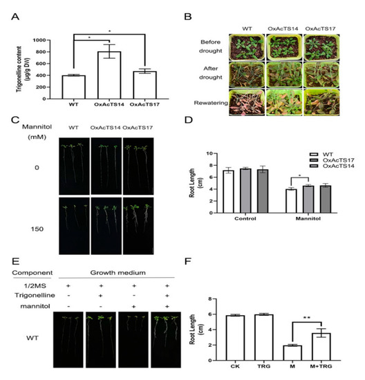To evaluate the role of AcTS in the drought response, transgenic Arabidopsis plants overexpressing AcTS (OxAcTS) were generated using the Agrobacterium infection method. As shown in Figure 5A, the contents of trigonelline in OxAcTS14 and OxAcTS17 were ~2-fold and ~1.2-fold higher than that of the wild-type Col-0, respectively. After 16 days of drought treatment, Col-0 showed either a severe yellowing phenotype or necrosis and failed to recover after 4 days of rehydration (Figure 5B). We found that the T3 generation of OxAcTS (OxAcTS14 and OxAcTS17) showed slight wilting after 16 days of drought, and the plants recovered quickly after 4 days of rehydration (Figure 5B). On half-strength Murashige and Skoog (MS) medium, there was no great difference in root length between Col-0 and OxAcTS (Figure 5C,D). On half-strength MS medium supplemented with mannitol, Col-0 and OxAcTS had comparatively shorter roots than those on half-strength MS medium, whereas the root length of OxAcTS was significantly longer than that of Col-0 (Figure 5C,D). On half-strength MS medium supplemented with trigonelline, Col-0 had larger leaves and longer roots than those on half-strength MS medium. On half-strength MS medium supplemented with mannitol and trigonelline, Col-0 had stronger and longer roots in comparison with those on half-strength MS medium supplemented with mannitol (Figure 5E,F).