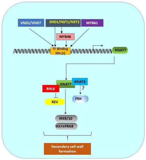 In a recent report, it was shown that KNAT7 and MYB6 heterodimers repressed SCW development in poplar and Arabidopsis while promoting anthocyanin synthesis [69]. The overexpression of MYB6 in transgenic poplar resulted in reduced SCW deposition, accompanied by the repressed expression of SCW biosynthetic genes. MYB6 has a DNA binding domain and interacts with the bHLH protein. KNAT7 also interacts with MYB6, MYB75, and MYB115 based on Y2H and BiFC data (Table 3). Therefore, it appears that the complex interactions of KNAT7 proteins with other cellular proteins play a major role in SCW formation in higher plants.