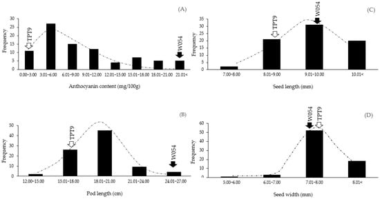 2.1. Variation in Pod Anthocyanin Content, Pod Length, Seed Length, and Seed Width