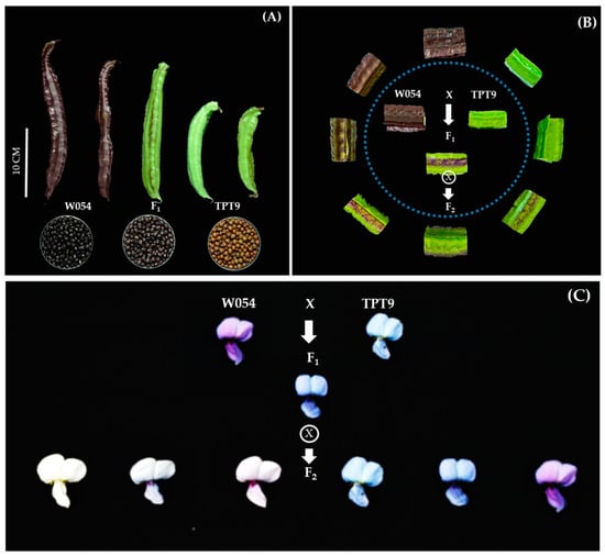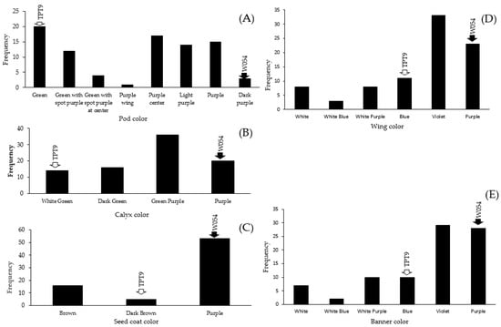 - Erskine, W.; Khan, T.N. Inheritance of pigmentation and pod shape in winged bean. Euphytica 1977, 26, 829–831. [Google Scholar] [CrossRef]