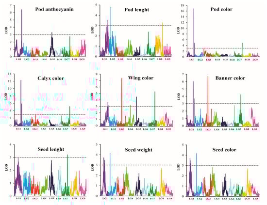2.4. QTL Analysis for Flower-, Pod-, and Seed-Related Traits