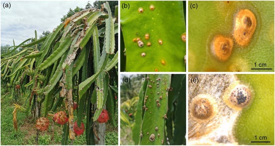 - Hong, C.F.; Gazis, R.; Crane, J.H.; Zhang, S. Prevalence and epidemics of Neoscytalidium stem and fruit canker on pitahaya (Hylocereus spp.) in South Florida. Plant Dis. 2020, 104, 1433–1438. [Google Scholar] [CrossRef] [PubMed]